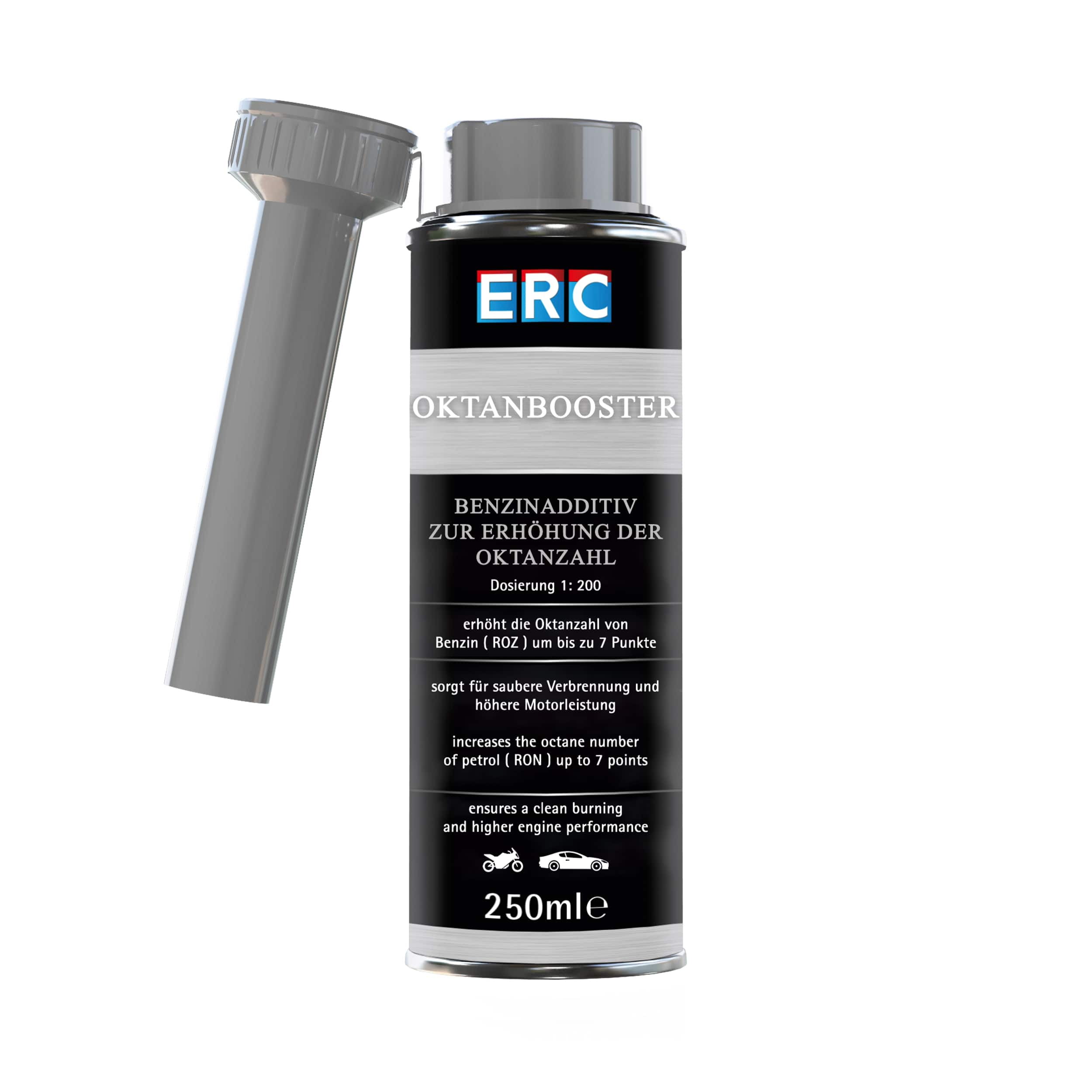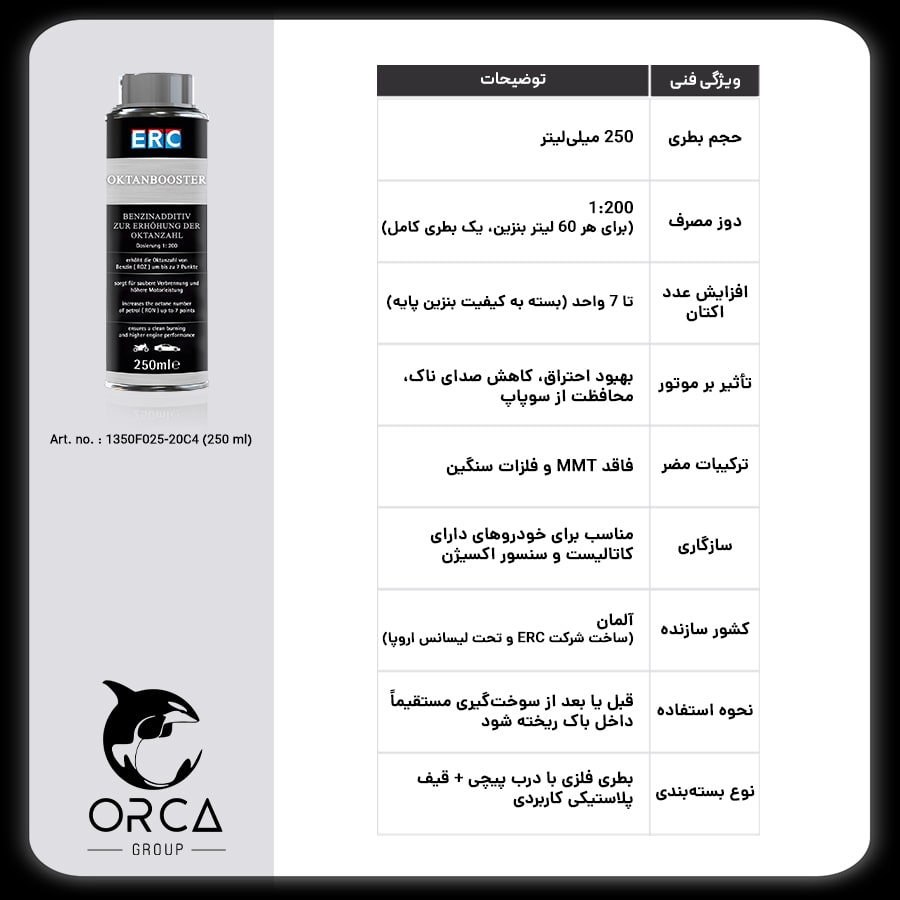 مکمل سوخت ERC Octane Booster محصولی پیشرفته از شرکت ERC آلمان است که برای افزایش عدد اکتان بنزین در خودروهای بنزینی طراحی شده. این مکمل با نسبت مصرف 1:200 مورد استفاده قرار میگیرد و هر بطری ۲۵۰ میلیلیتری آن برای ۶۰ لیتر بنزین کافی است.