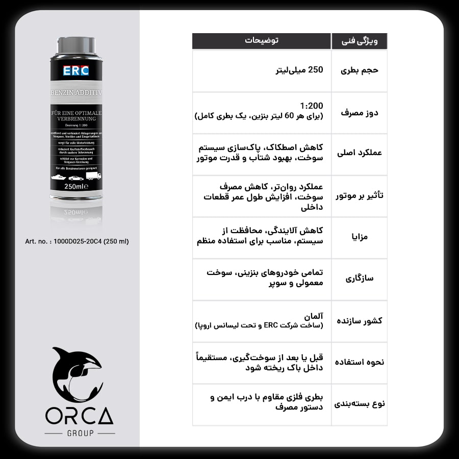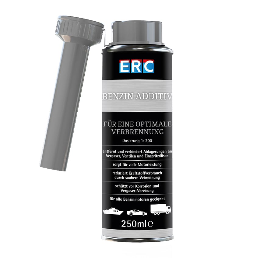 مکمل ERC Petrol Additive محصولی تخصصی از شرکت ERC آلمان است که برای نگهداری منظم و پیشگیرانه از سیستم سوخت خودروهای بنزینی طراحی شده. این افزودنی با نسبت مصرف 1:200 استفاده میشود و هر بطری ۲۵۰ میلیلیتری آن برای ۶۰ لیتر بنزین مناسب است.